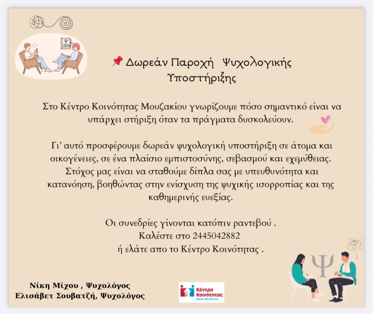 ΔΩΡΕΑΝ ΠΑΡΟΧΗ ΨΥΧΟΛΟΓΙΚΗΣ ΥΠΟΣΤΗΡΙΞΗΣ ΑΠΟ ΤΙΣ ΨΥΧΟΛΟΓΟΥΣ ΤΟΥ ΚΕΝΤΡΟΥ ΚΟΙΝΟΤΗΤΑΣ ΔΗΜΟΥ ΜΟΥΖΑΚΙΟΥ